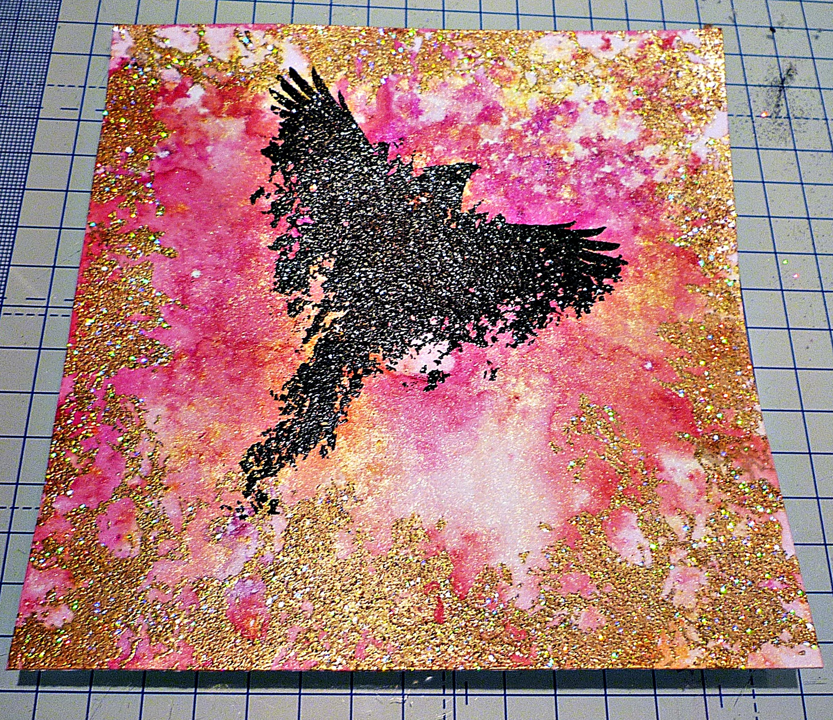 I stamped the Phoenix with Black Versafine Clair ink using my stamping platform a few times to get a solid coverage then heat embossed it with Wow black glint embossing powder.